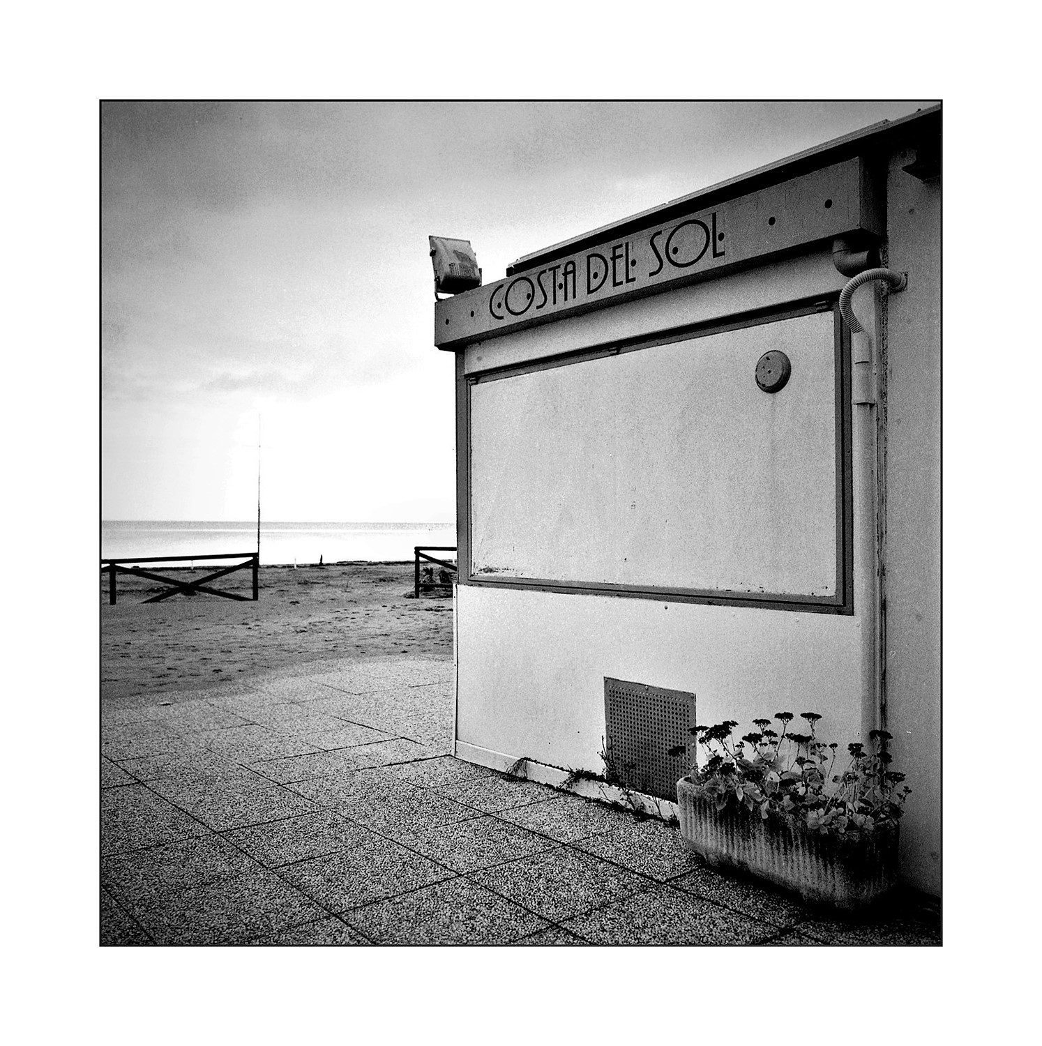| Ottima scena di fine estate . Con un bianco e nero cupo e vignettato riesci a trasmettere la malinconia e l'abbandono in cui versa la spiaggia a fine stagione. Bella l'insegna che inneggia al sole in contrasto con un cielo di tutt'altro parere. Precisa la composizione con l'angolo giustificato in alto e il formato quadrato. Un saluto, guido |
