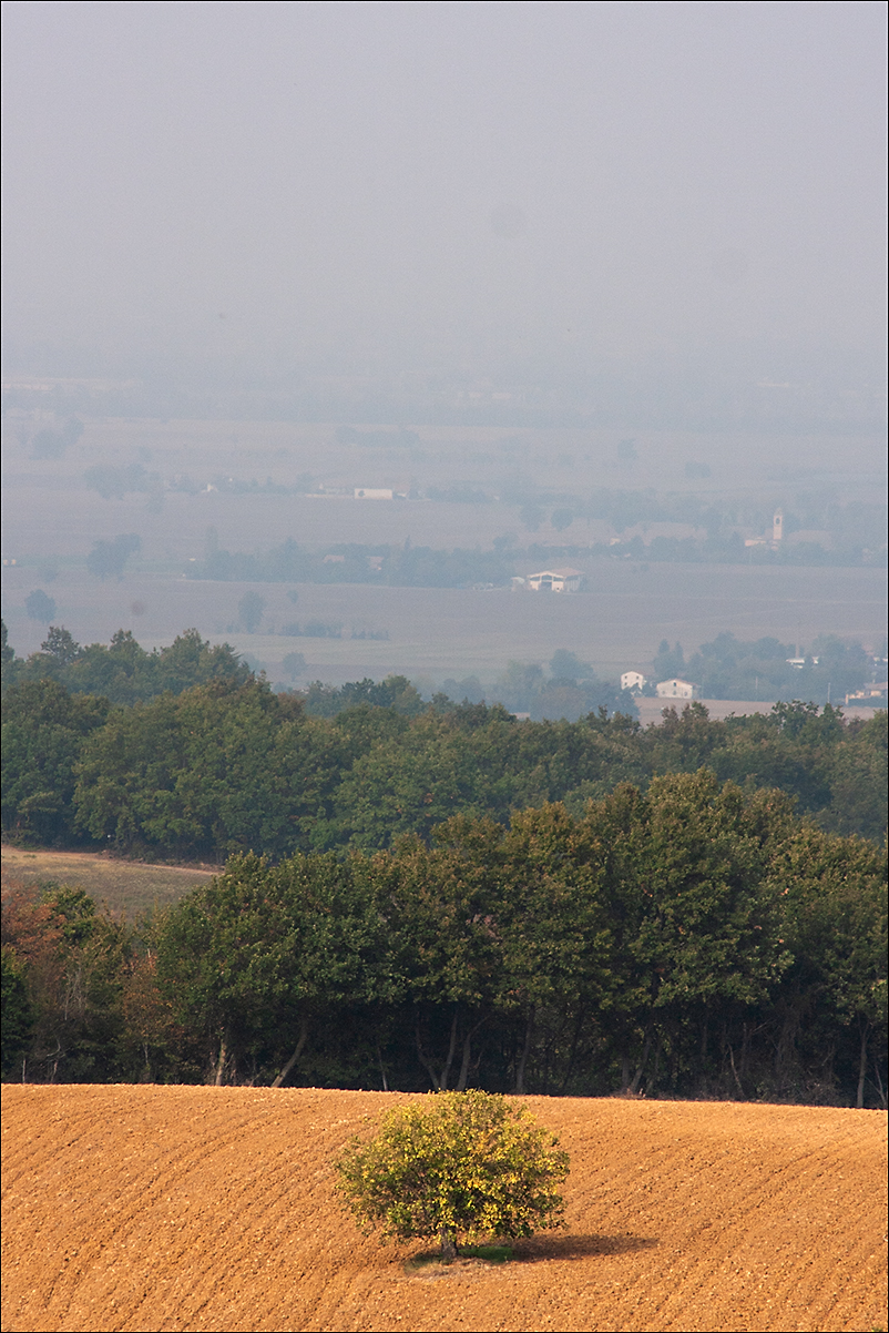 A me non dispiace lo spazio ampio riservato al cielo ( a parte qualche macchia del sensore) che diventa uno spazio in cui lentamente va a dissolversi il paesaggio. E' una foto con la tua impronta gentile, i colori sono caldi e vivi, eppure non urlano, io trovo un gran bell'equilibrio in questa immagine. Complimenti