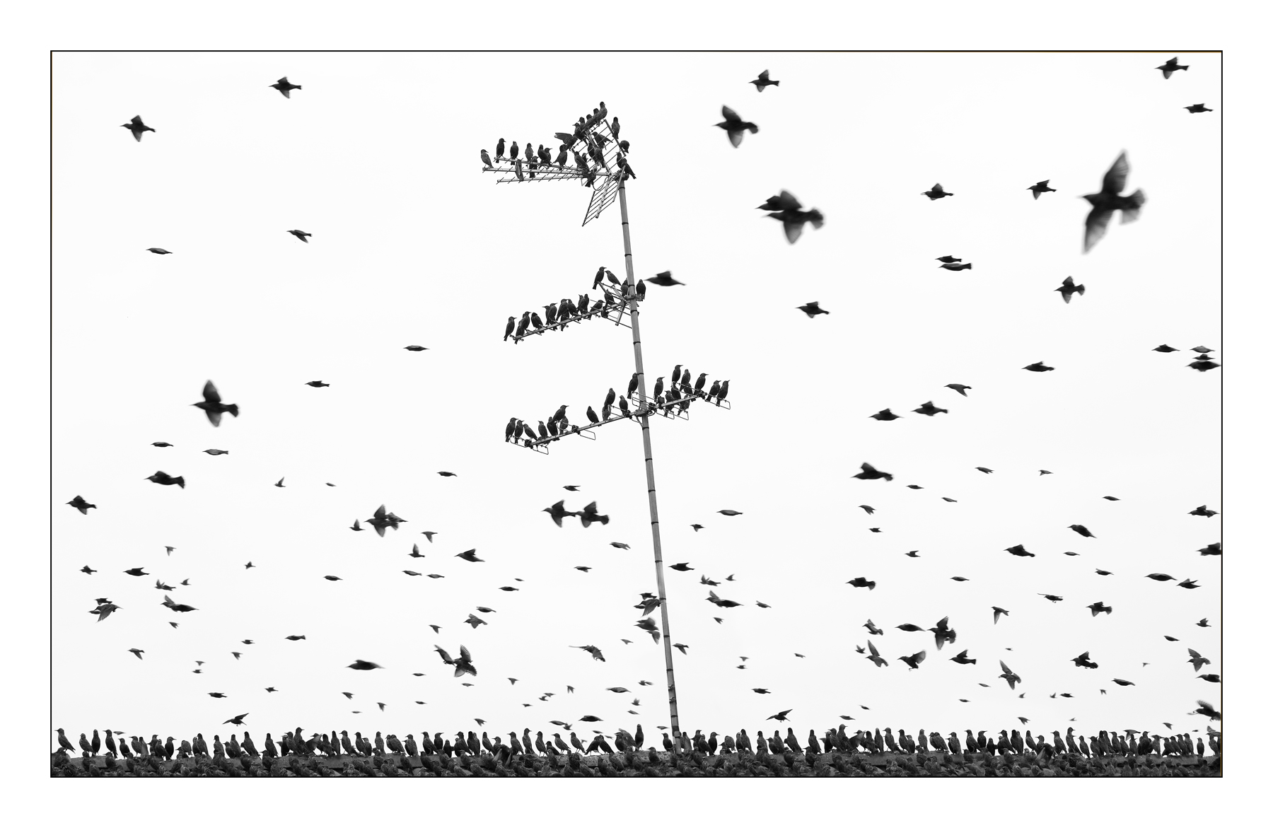 Lo definirei uno scatto piuttosto affollato, chissà se quella povera antenna ce l'avrà fatta a reggere il peso di tutti quegli storni, almeno credo lo siano visto che questa è la loro stagione.