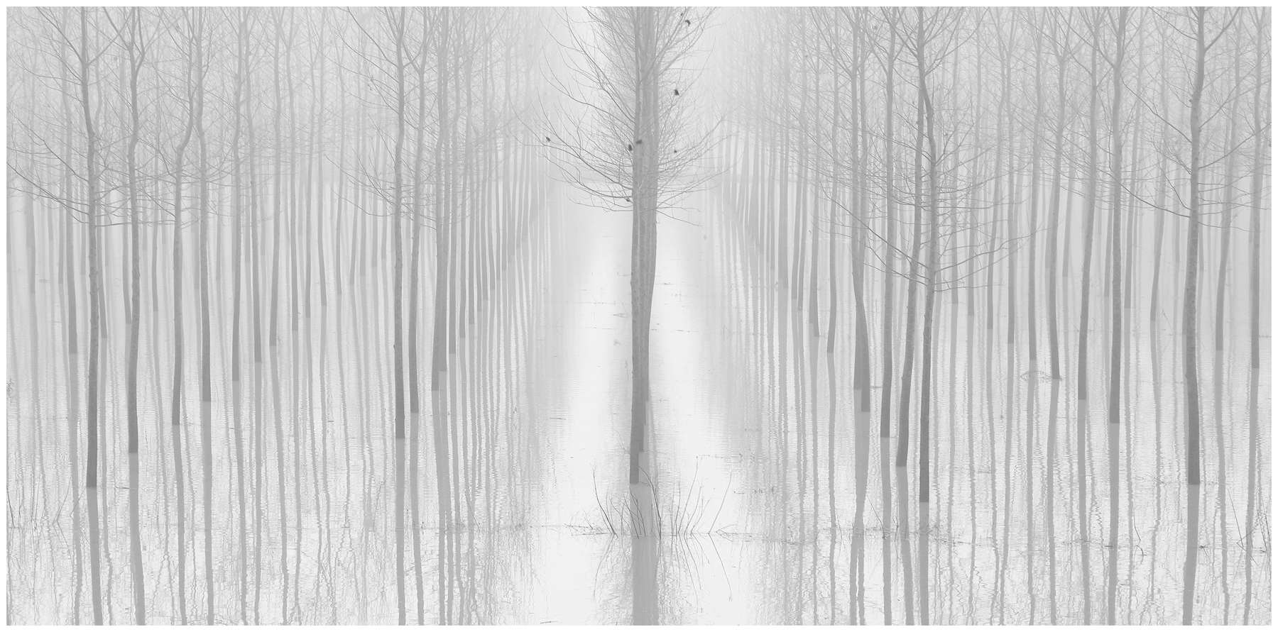 Il rigore dei filari e la composizione perfettamente simmetrica ribaditi dal riflesso ed avviluppati dalla leggera foschia danno vita ad una scena eterea, quasi evanescente direi.
