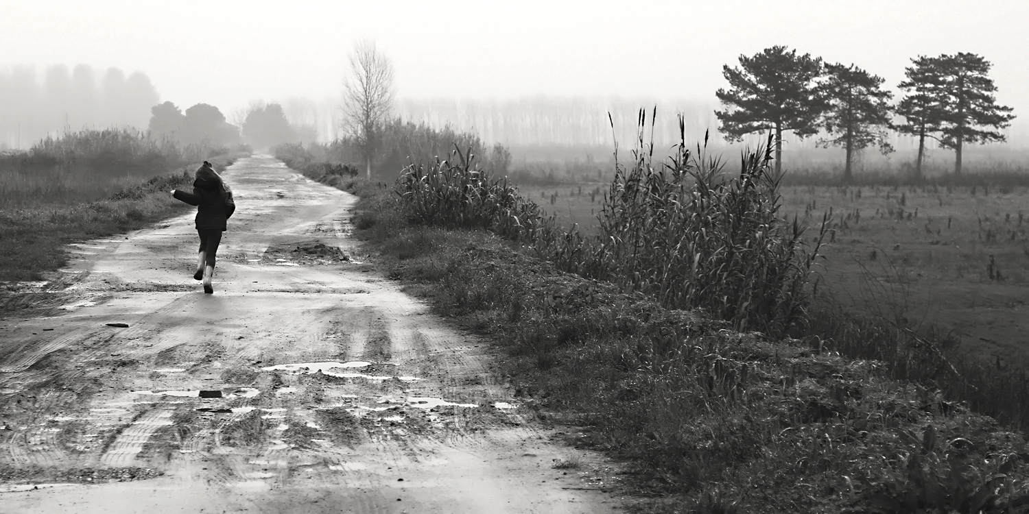 Un grande primo piano con il fango che ti da la sensazione di esserci dentro e che di slancio la bambina ha appena superato per proseguire verso il fondo silenzioso, ovattato. Una scena molto dinamica suffragata dalla diagonale del ciglio della strada sterrata e in contrasto con il fondo immobile, tenue, onirico, dove sembra cozzare la strada.