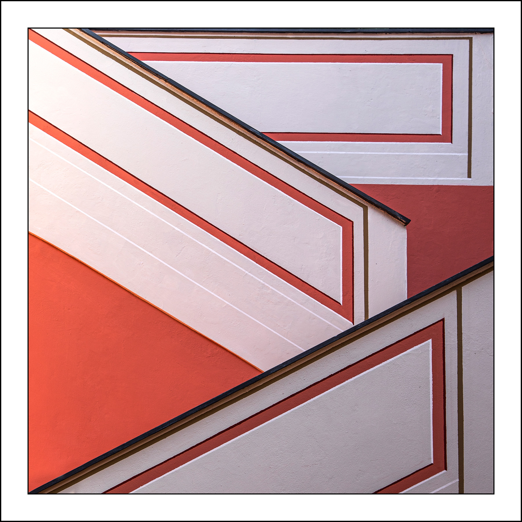 Composta a pennello e con millimetrica disposizione delle vie di fuga oblique che confluiscono negli angoli a sinistra del fotogramma. Piacevola anche la presenza del colore del muro. La parte a destra forse ha una caduta di luce eccessiva rispetto al vicino margine superiore sinistro. Forse qualcosa si può fare in fase di PP con luce di schiarita.