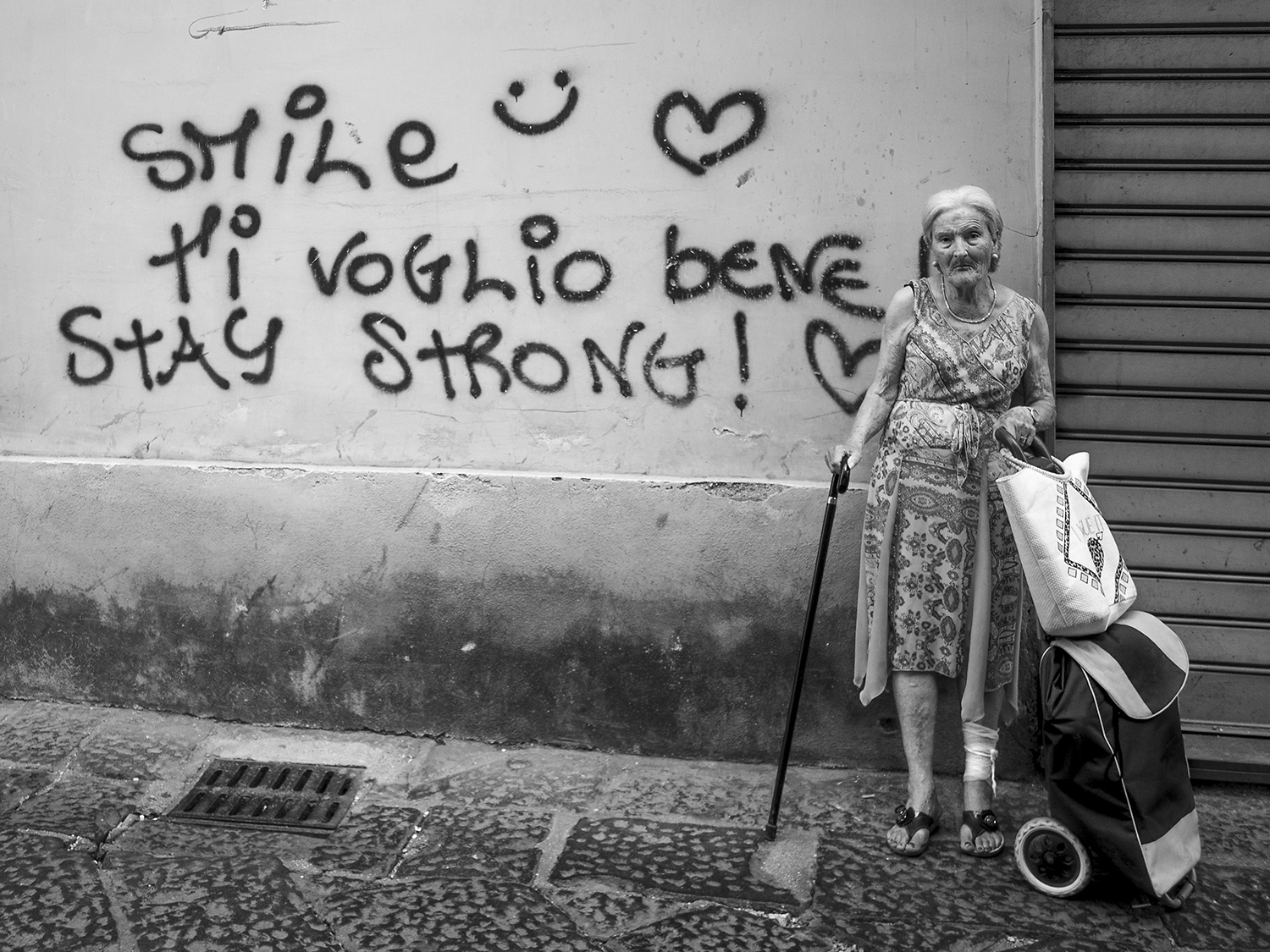Forse per essere una street pura mi pare troppo posata... ma l'accostamento ed il contrasto fra scritta e soggetto sono davvero ben assortiti.