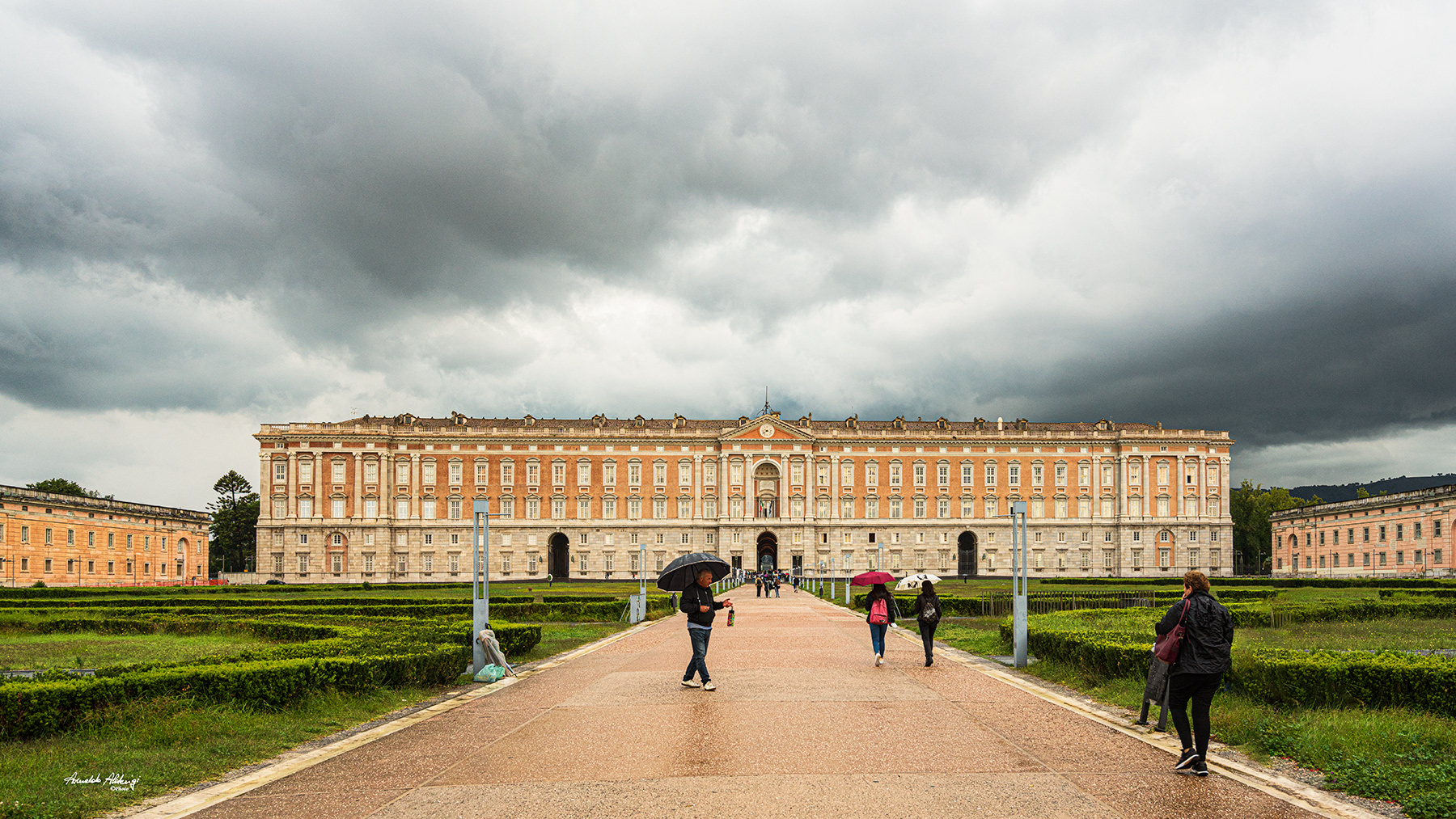 L'architettura è palesemente ed ovviamente più che meritevole di essere raffigurata, mi colpisce in maniera molto positiva lo scontro cromatico tra il cielo plumbeo e le tenui tinte calde della Reggia.
