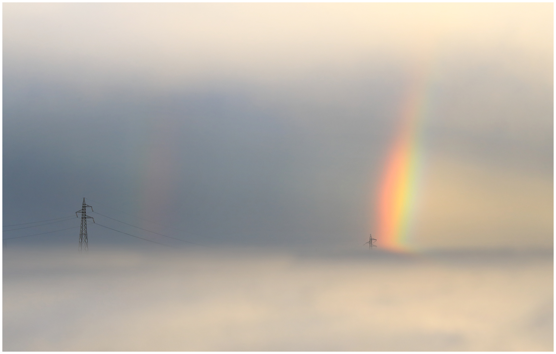 Uno scatto onirico. Quei tralicci che sembrano galleggiare tra le nuvole donano un fascino particolare agli arcobaleni.