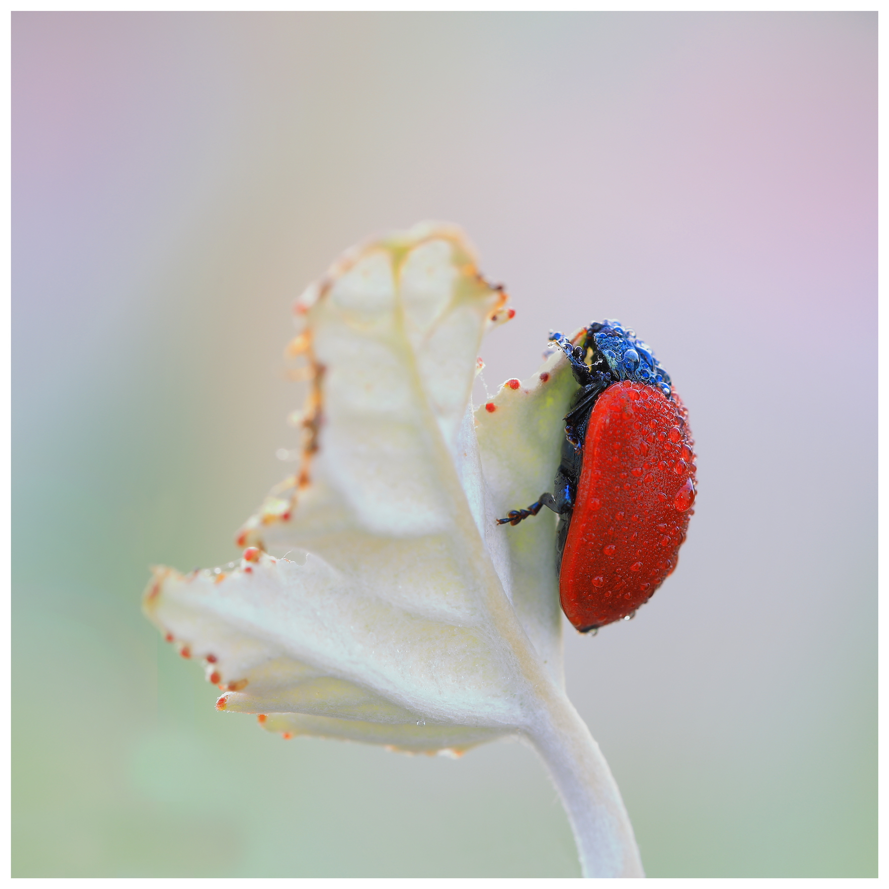 I colori sono stupendi, il posatoio un po sfumato, tenue, delicato, si amalgama molto bene con lo sfondo. Il coleottero con le sue goccioline è una perla.