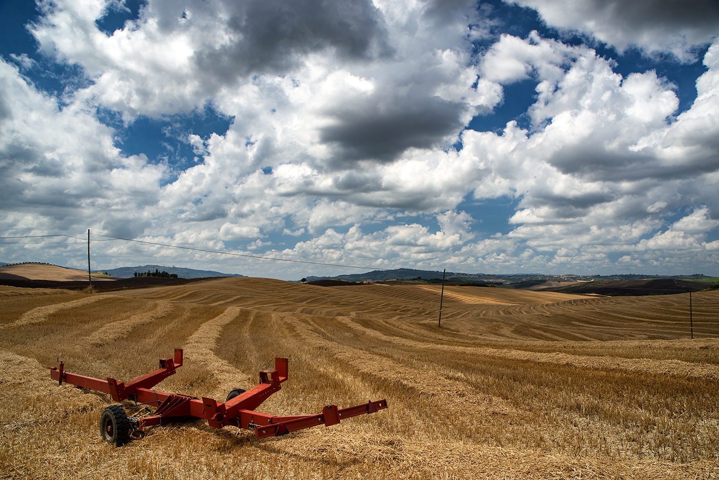 Molto bello il sinuoso terreno lavorato e lo spot luminoso in lontananza, corretta la scelta di posizionare il carrello agricolo in disparte creando così un perfetto proscenio per il panorama che si apre davanti ad esso e comunque grazie al suo bel rosso non passa certo inosservato.