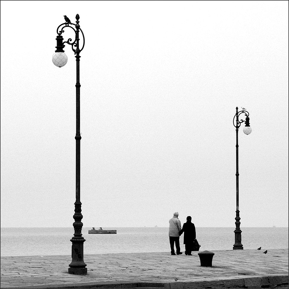 ciao Sergio, tu sai quanto io ami quel luogo, il molo Audace è una fonte ispiratrice immensa, e in questo scatto hai fatto centro, lo scatto delle tre coppie, la prima con i soggetti principali, la seconda coi lampioni, la terza con i due gabbiani appollaiati sul lampioni, uno bianco e uno nero... spettacolare!