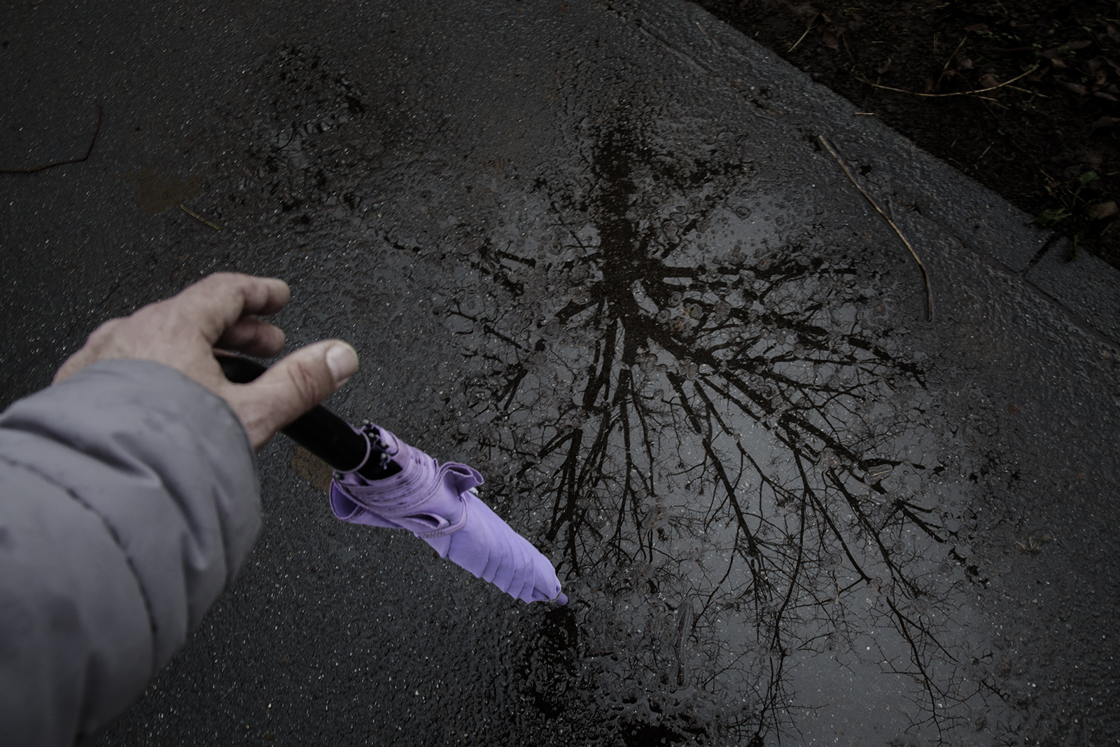 una visione autunnale-invernale originale, l'albero ormai spoglio riflesso nella pozzanghera e l'ombrello indispensabile in questi giorni.
