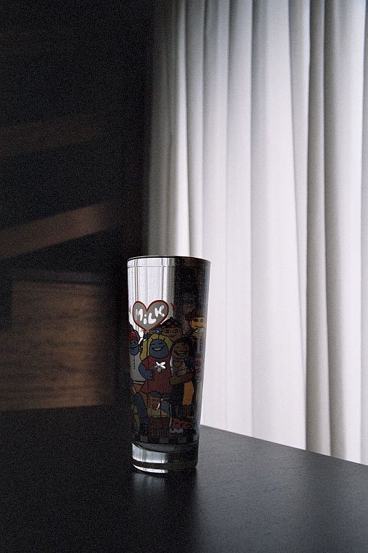 poco illuminato da davanti , il fondale ,mezzo di legno e mezzo di tenda non rende bene , fa scomparire i dettagli del bicchiere , era meglio tutta tenda in modo che il bicchiere fosse avvolto dalla luce , come in una scatola di luce , anche un cartoncino bianco che copriva il legno avrebbe illuminato di piu , la base nera cancella le ombre ok
