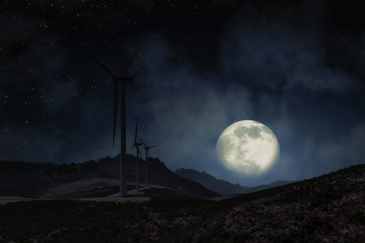 Ottima la scena notturna con un cielo stellato, una grande luna che domina le montagne sullo sfondo e le pale che si innalzano al cielo e dominano la vallata.