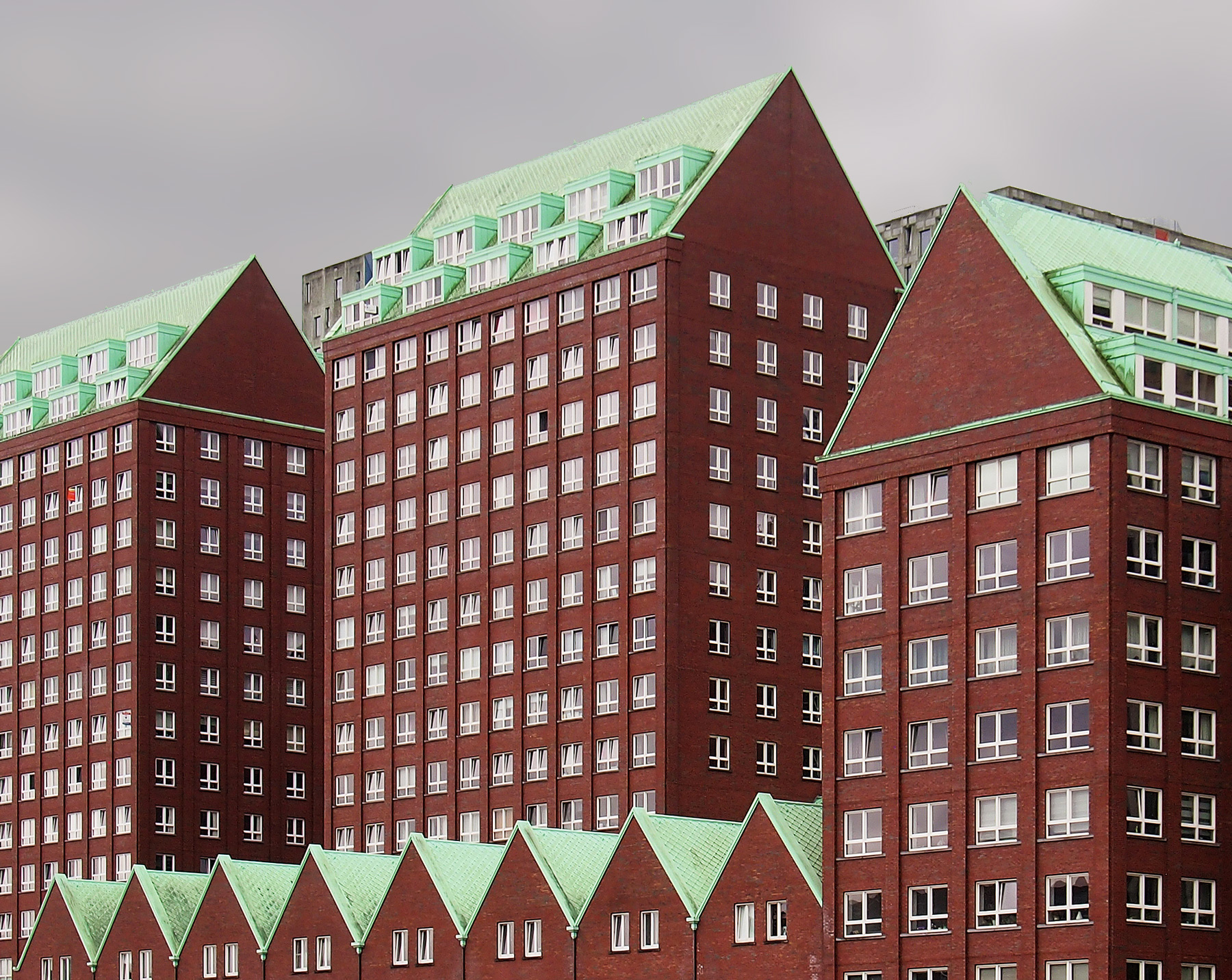 Molto gradevole e impattante questo alternarsi di rossi mattone e verdi chiari in un contesto di linee rette, linee a zig-zag, triangoli, rettangoli, volumi compatti arricchiti da una miriade di finestre...