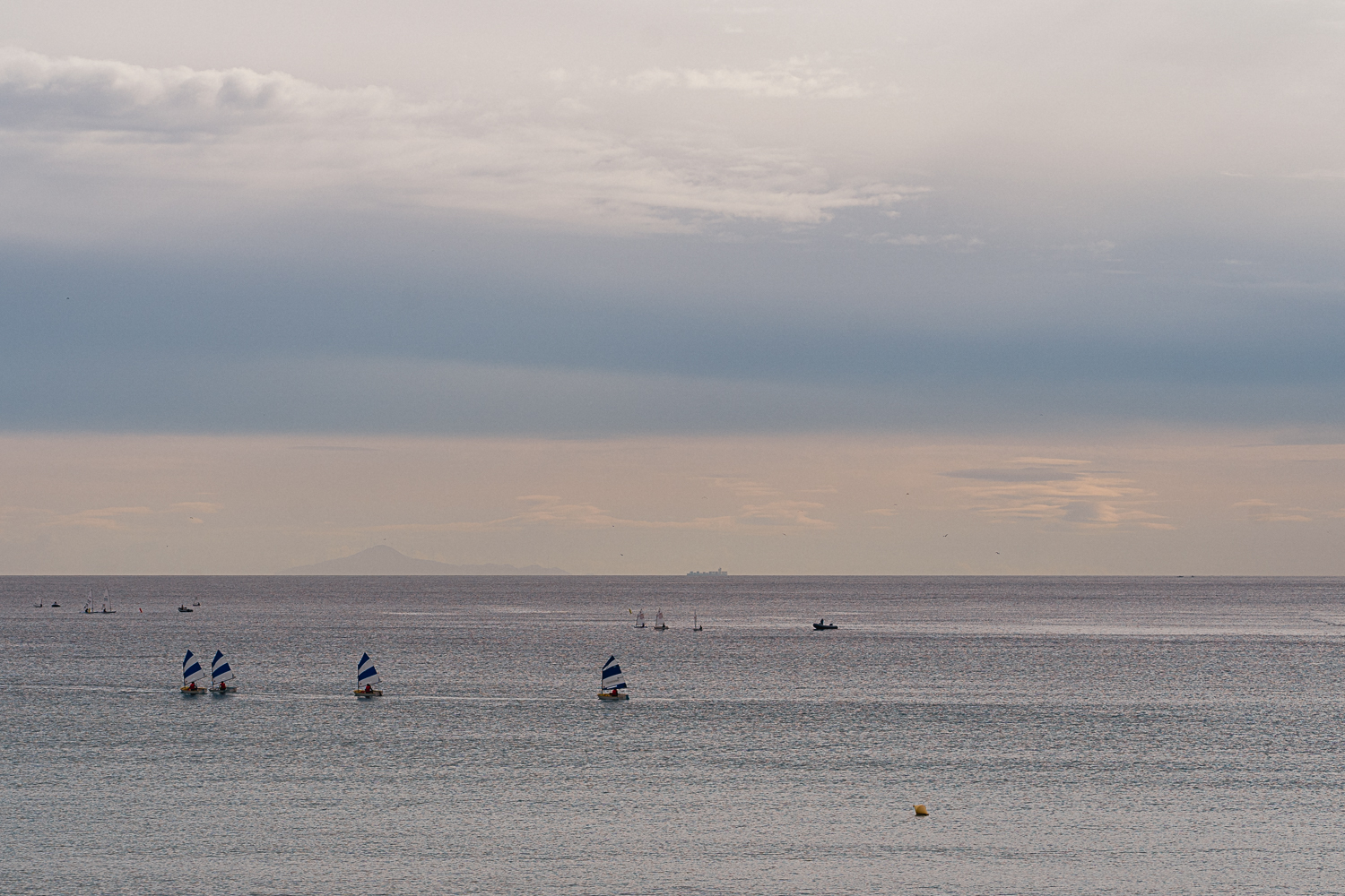 Le barche a vela, ben distribuite nel frame, su un mare dalle tinte pittoriche e con le sue increspature leggere introducono lo scatto e danno profondità.