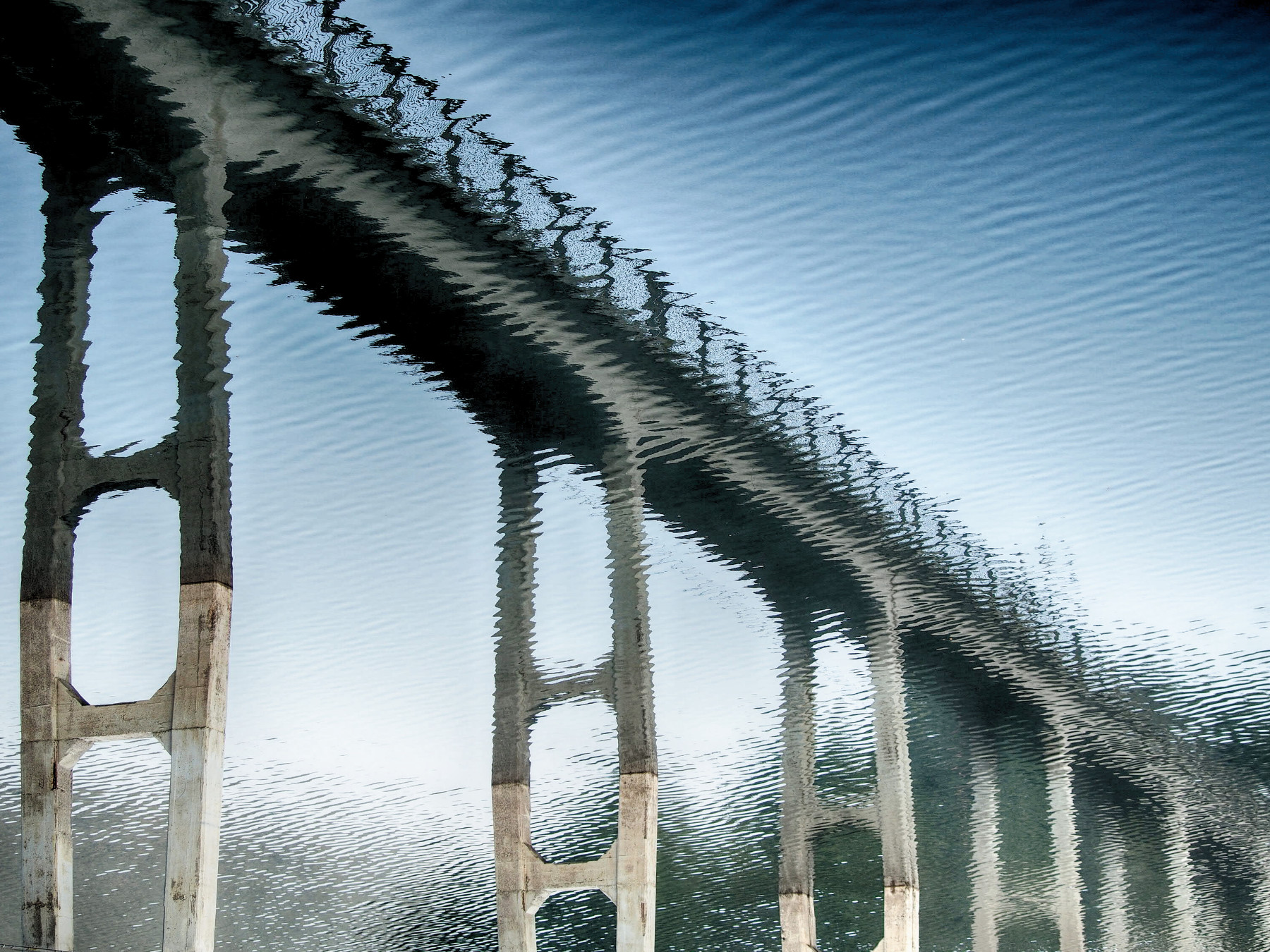 Un ribaltamento che attira lo sguardo, le increspature dell'acqua che distorcono il ponte creano una specie di illusione ottica quasi ipnotica, il blu azzurro che si trasforma gradualmente in verde acqua ha il suo fascino.