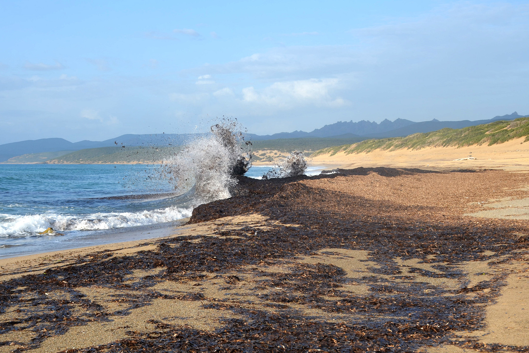 Una spiaggia meravigliosamente solitaria,le alghe strappate al fondale e portate a riva da qualche forte mareggiata,l'abbraccio di questi spruzzi bianchi e neri:tutto concorre alla riuscita di questo scatto piacevolissimo anche per colore e composizione. Ciao,Sergio.