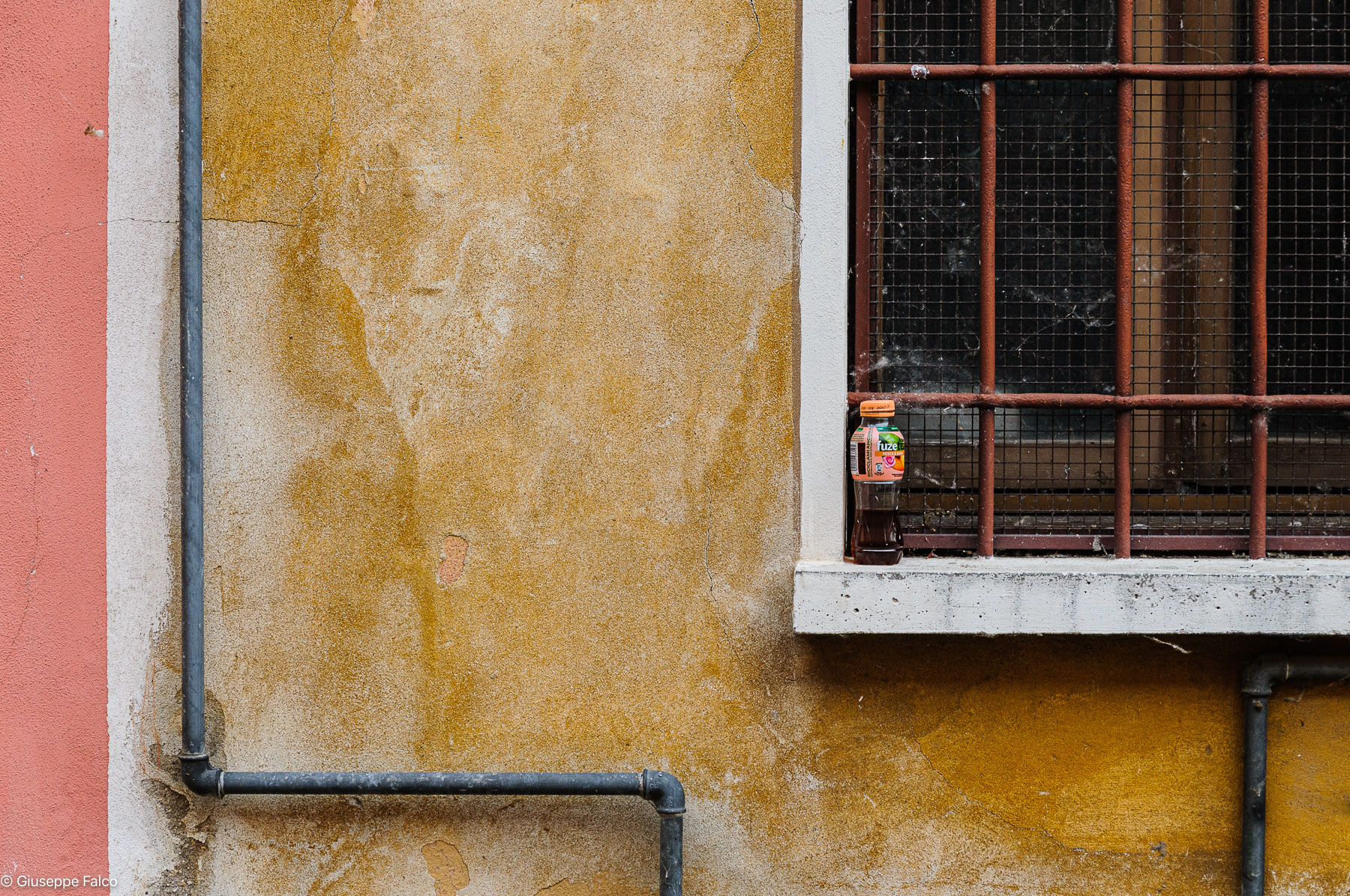 Le ragnatele, gli scrostamenti, la bottiglia colorata di plastica, ci raccontano un po la storia di questo scorcio.