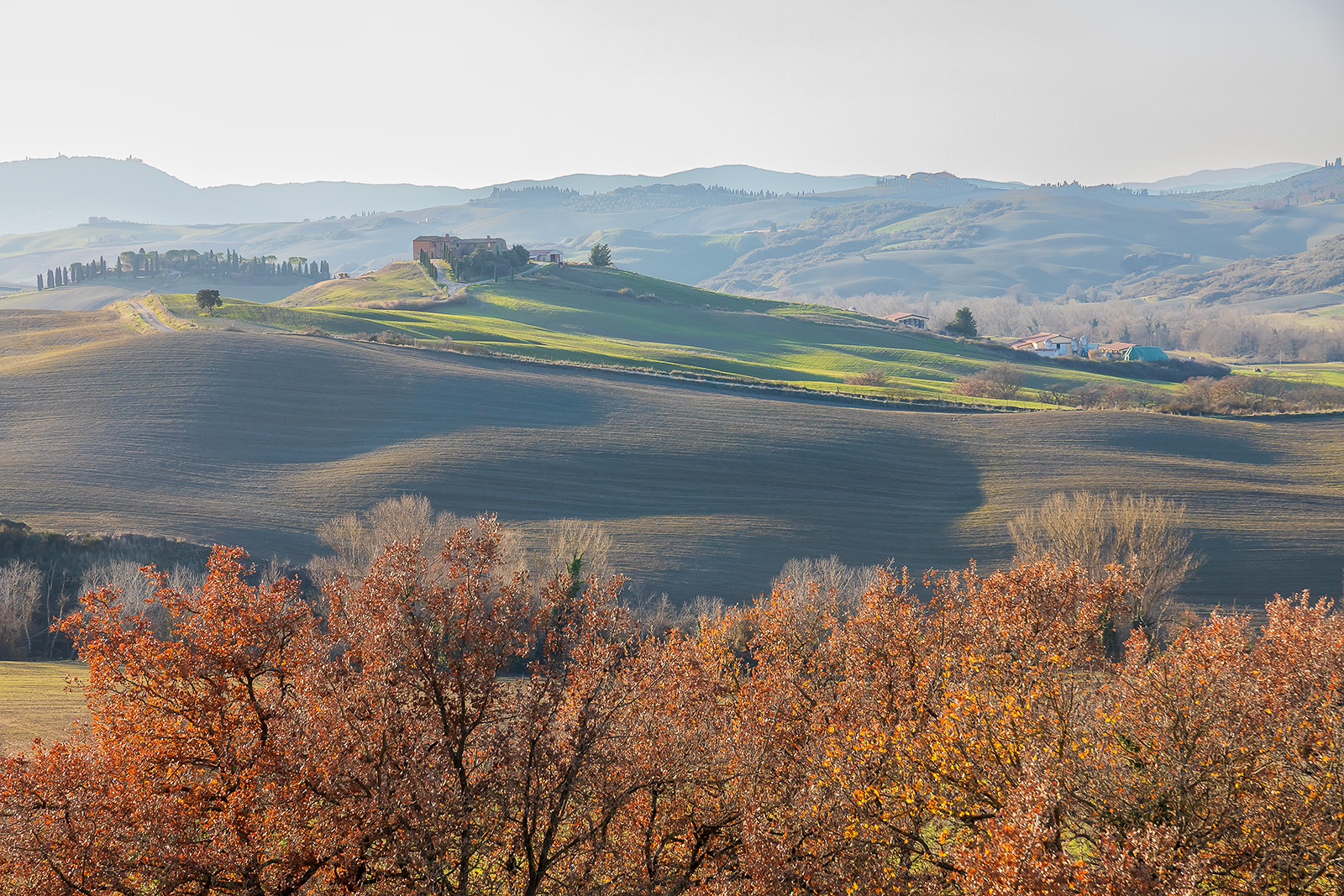 Paesaggio colinare gradevole. Buona la luce che crea ombre lunghe.Il bel piede degli alberi colorati danno profondità all'immagine.