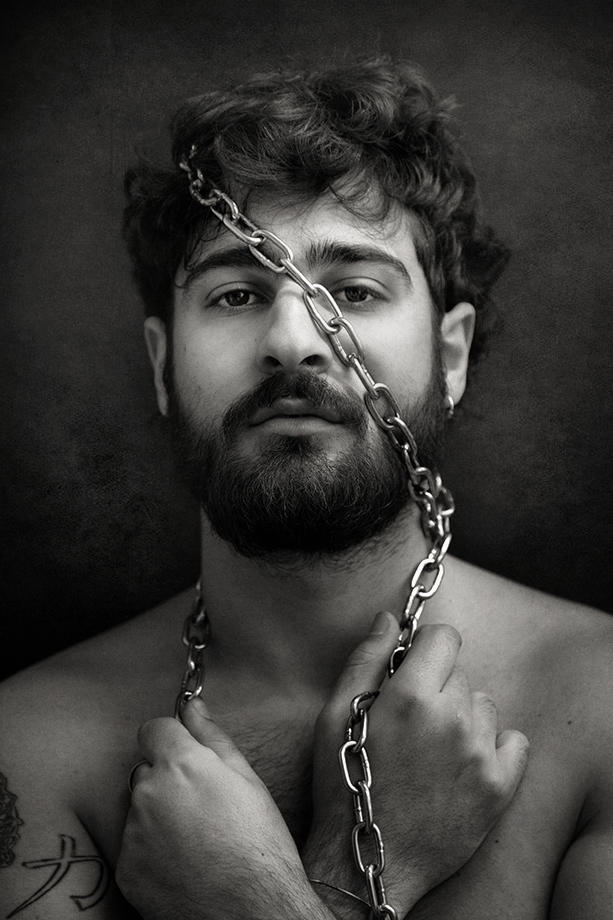 Questo ritratto è davvero potente! La scelta del bianco e nero esalta le texture e le ombre, rendendo l'immagine molto drammatica. La catena che attraversa il viso del soggetto crea una linea diagonale forte che guida lo sguardo, e il contrasto tra la durezza del metallo e la pelle è molto efficace. L'espressione del soggetto è intensa e penetrante, catturando davvero l'attenzione. Complimenti hai fatto un lavoro eccezionale nel catturare così tanta emozione e profondità!