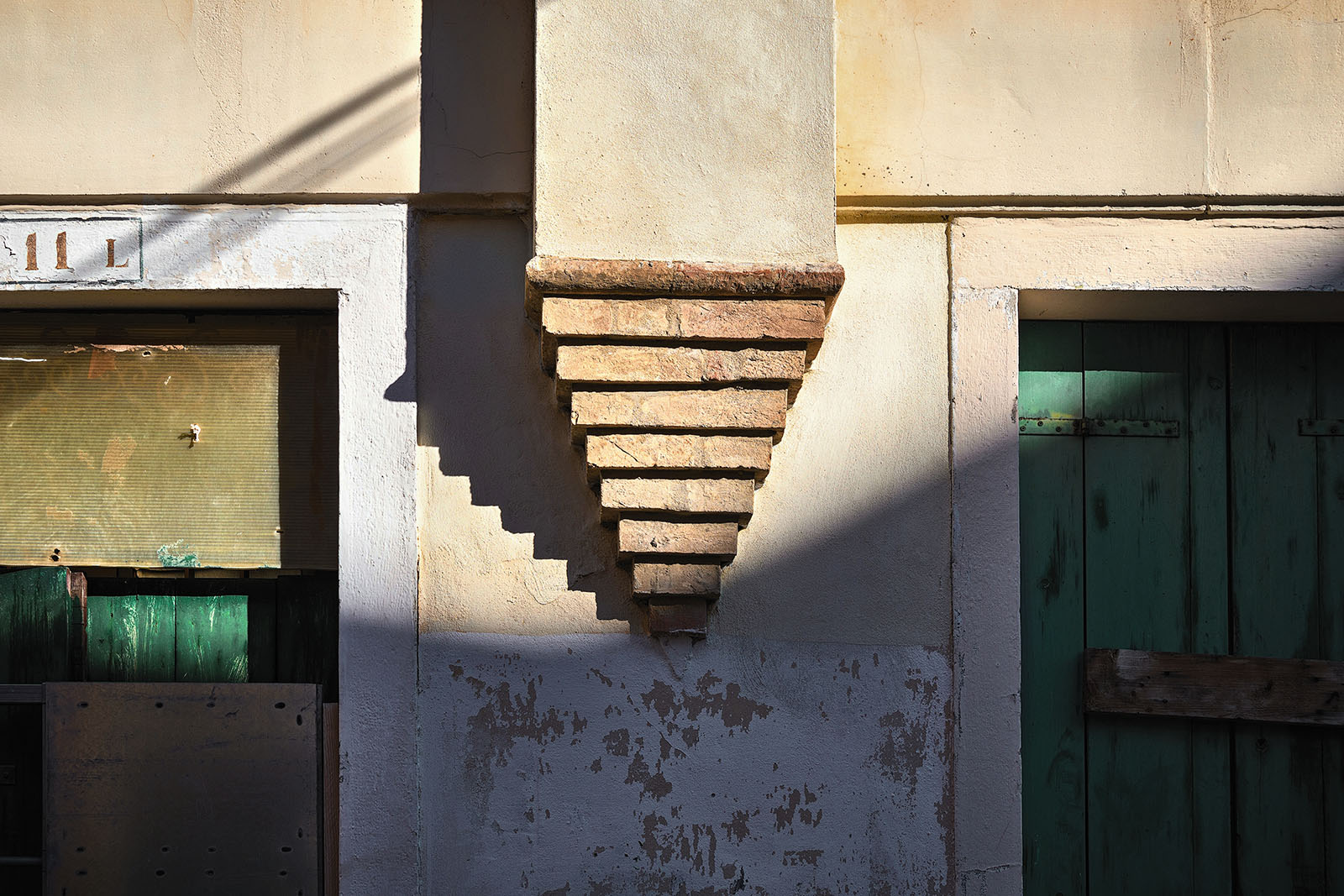 A me piace questa immagine… Oltre al bel gioco di luci, ombre e geometrie, trovo gradevolissima la tonalità di verde illuminata dal sole e il contrasto che crea sulle tonalità tenui della struttura Forse un po’ troppo ampia la zona in ombra in basso, ma nel complesso la proposta è valida