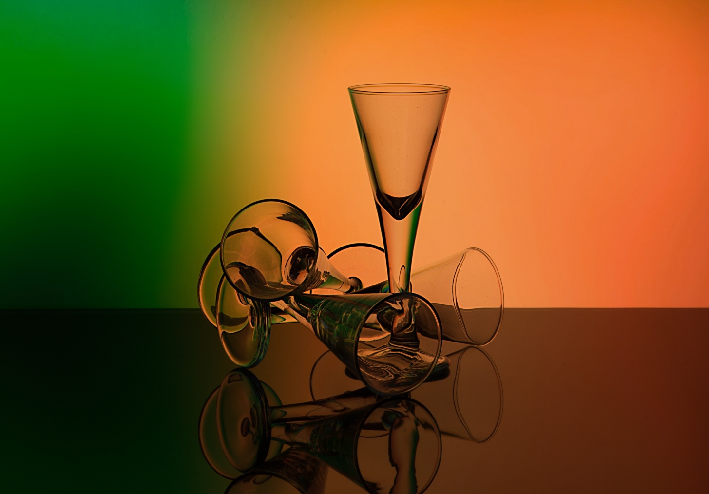 Bello il graduale passaggio cromatico, interessante l'attenta disposizione dei bicchieri.
