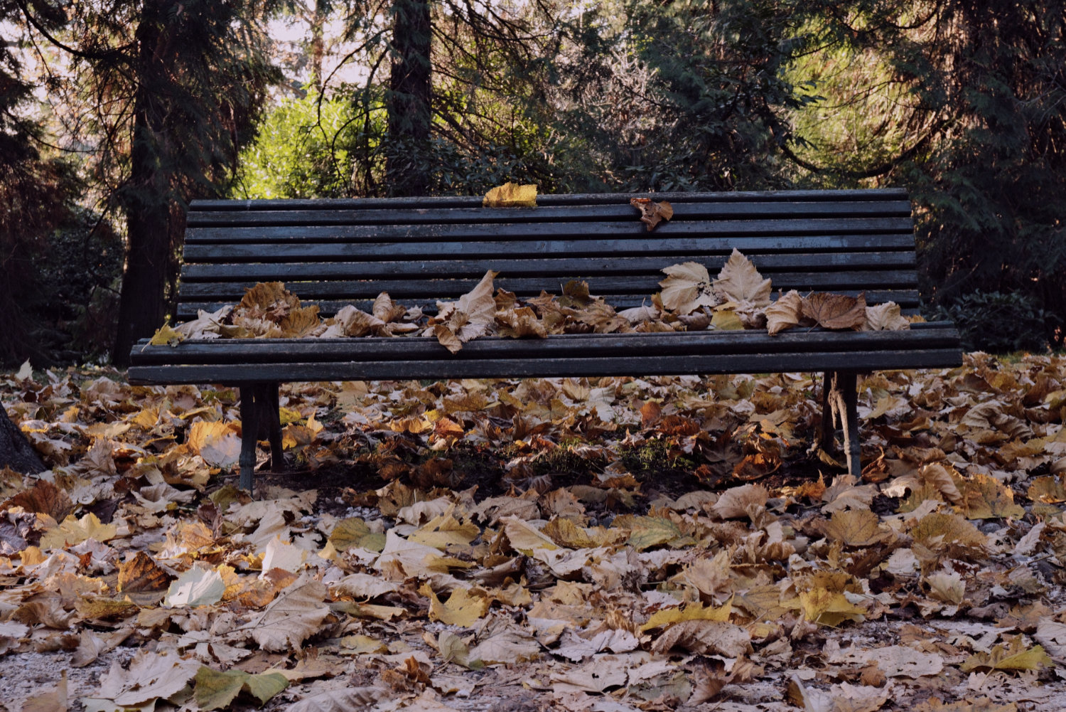 Uno scatto dalla vena vagamente analogica, il tappeto di foglie sia sul selciato che sulla panchina fornisce un certo dinamismo alla composizione.