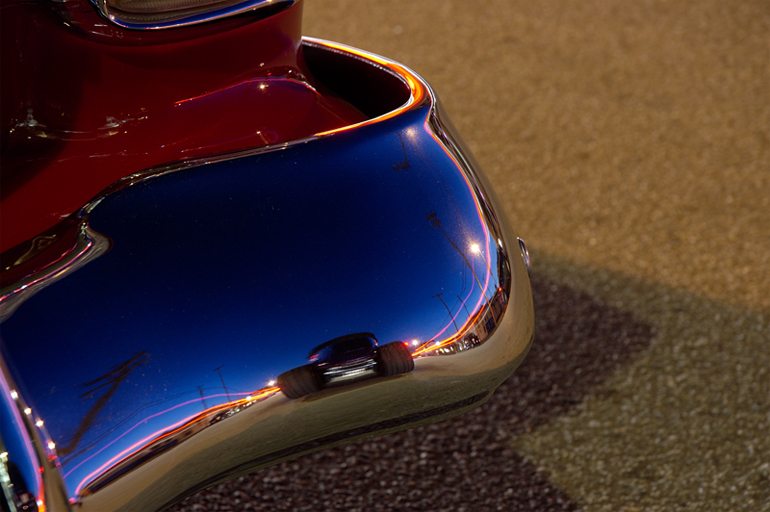Bella l'ora blu scelta, l'idea di sfruttare il riflesso del paraurti cromato che anche solo per affinita' ci riporta al tipo di macchina (anche se il modello che immaginiamo non e' proprio quello non importa, e' il tipo) e ben composta