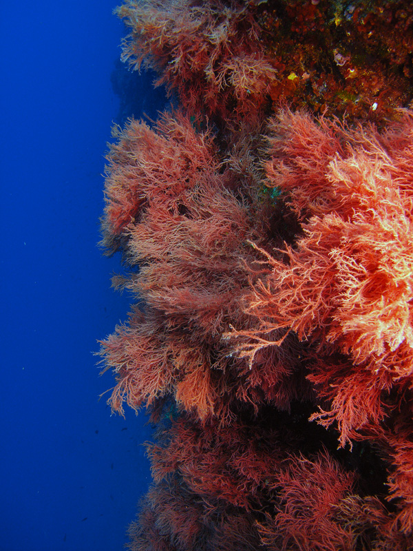 Parete a strapiombo completamente colonizzata da alghe rosse.