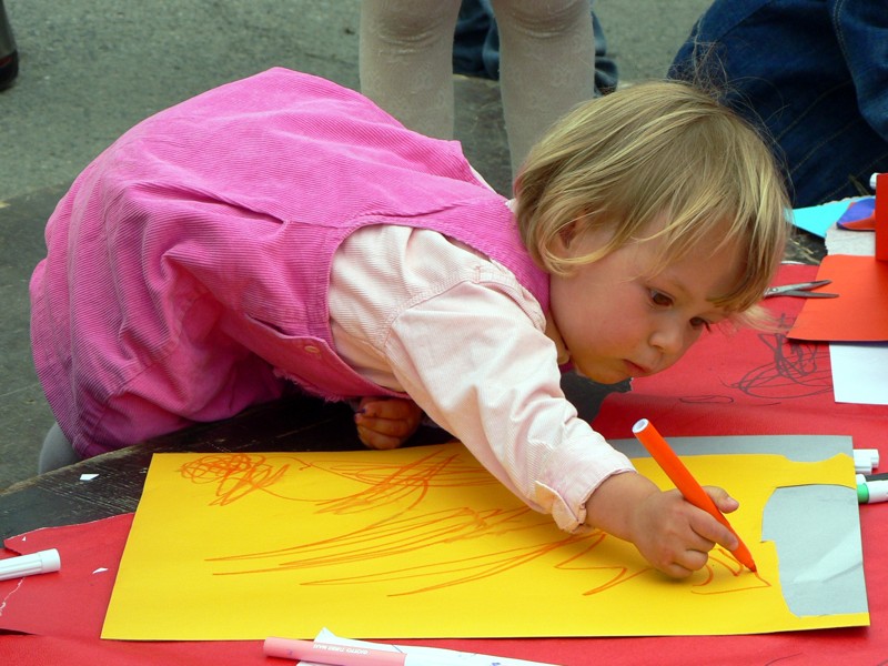il momento colto è molto tenero! Con quanta cura ed impegno, la bimba, svolge il suo "lavoro" Intenta in quello che sta facendo, senza distrazioni, deve far vedere quello che vale!. Buono l'angolo di ripresa avrei pero' fatto spostare dietro, lo sfondo con quelle presenze, rovinano un po' l'immagine o altrimenti avrei ripreso piu' da vicino tagliando sopra e spostando lo spazio a dx, Un poco di contrasto in piu' e, almeno a mio gusto un pochino meno saturi i colori! Se non ti dispiace, vorrei proporti un mio taglio!