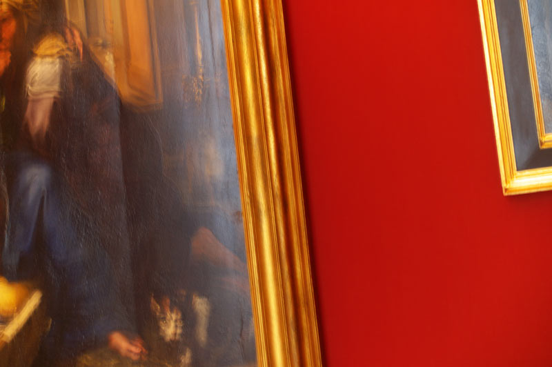 La foto si fa notare per l'originalità della composizione, non so dirti se io l'avrei composta nello stesso modo, ma certamente è interessante come le due masse date dai quadri si contrappongono sul bello sfondo rosso.