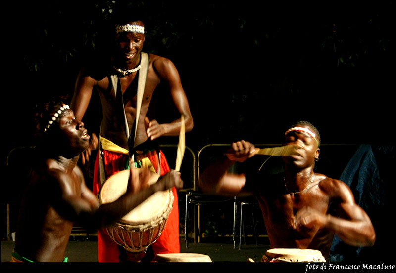 La luce laterale e radente è molto bella. E' uno scatto molto "tribale": si apprezzano i fisici asciutti e dorati, il movimento feroce e infernale dei tamburi. La composizione mi sembra buona. Come ti ha detto rogia80 la vista delle transenne ci riporta un pò troppo con i piedi per terra. Forse con un accurato lavoro di postproduzione si potrebbero eliminare..