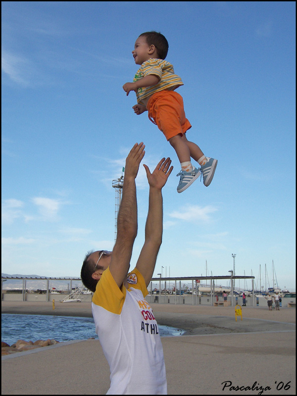 immaginala scattata dal basso, alle spalle del papà, del quale si vede solo la testa e le braccia e, in alto, il bimbo che sbuca volandogli sopra con espressione divertita e felice.