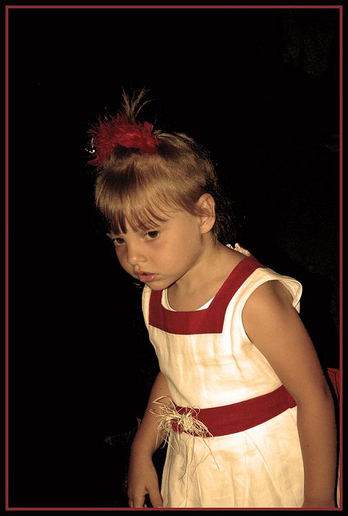 Un'espressione ineressata e curiosa che strappa un sorriso all'osservatore. Una bella bimba. Avrei abbassato l'inquadratura per togliere un po' di nero sopra ed includere le mani sotto. Probabilmente uno scatto colto al volo. Anche la condizione di luce non ti ha reso facile il compito del flash che sembra sparare un po' troppo sul vestitino. Ciao