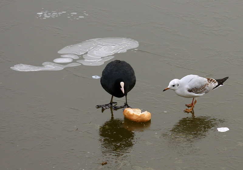 Foto 5: nonostante l’avvicinarsi del giovane gabbiano la folaga non indietreggia di un centimetro, anzi…………to be continued