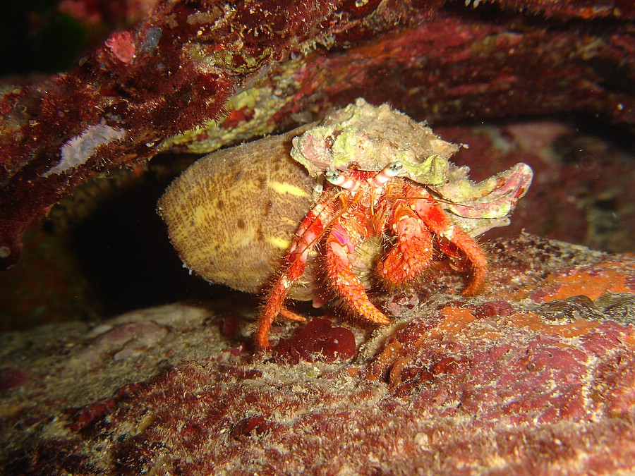 Paguro (dardanus arrosor) a passeggio in un anfratto.