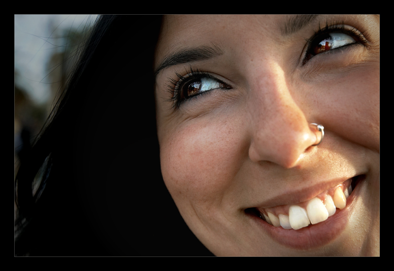 Il neo principale è stato già evidenziato ma del resto è rimediabile.. io aggiungo una nota: dal momento che lo sfondo è comunque ridotto ad una zona piccolissima (è nata così o è un 'crop'?) sarebbe stato forse meglio aumentare la PdC in modo da avere a fuoco entrambi gli occhi, perché sorridono in modo veramente coinvolgente! |