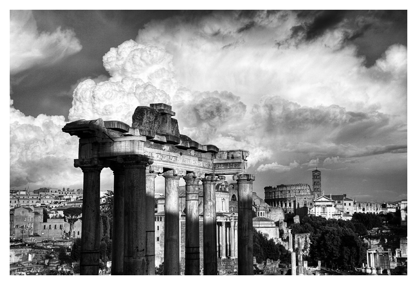 Bellissimo il cielo ed il viraggio bianco/nero. Avrei preferito che le colonne in primo piano non fossero state tagliate.