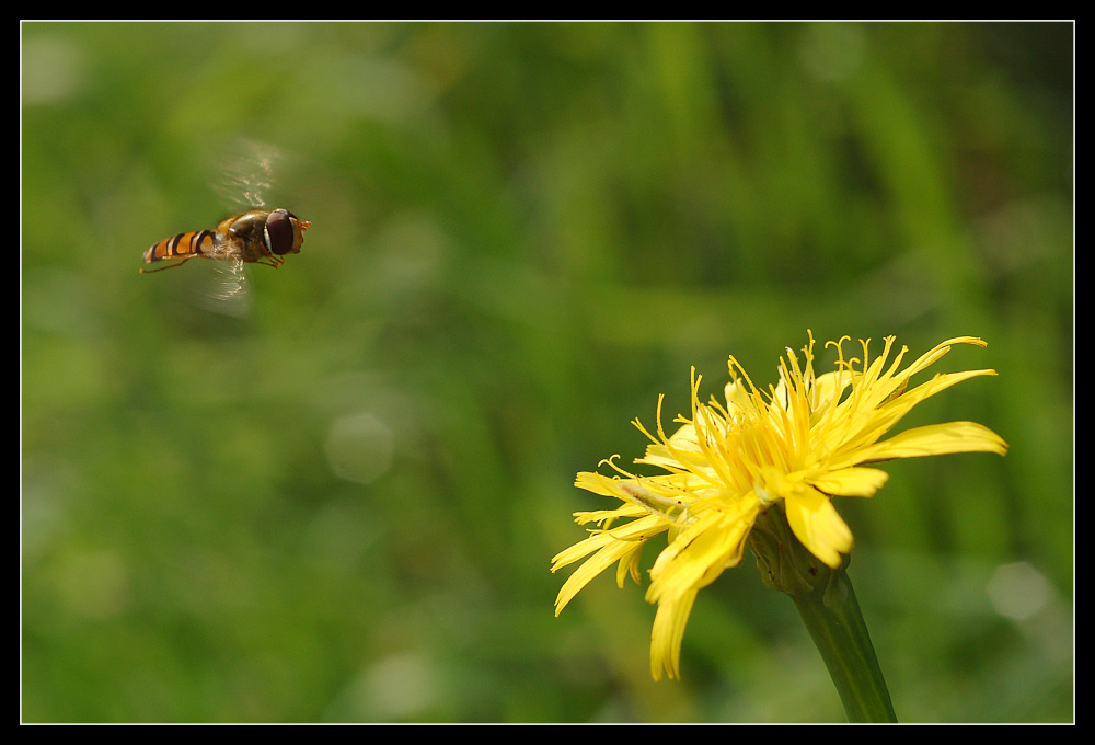 allora...ho inquadrato il fiore e lasciato spazio libero sulla sinistra e atteso che passasse di li il dittero che stava ronzando attorno al fiore...ho messo a fuoco al volo e scattato...questa è venuta a fuoco...però prima ne ho dovute scattare una decina!
