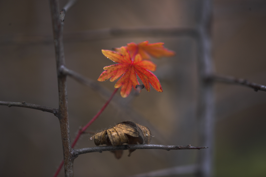 La quasi monocromaticita' della scena e' spezzata dal colore forte della foglia, e visivamente cio' ha molto impatto.