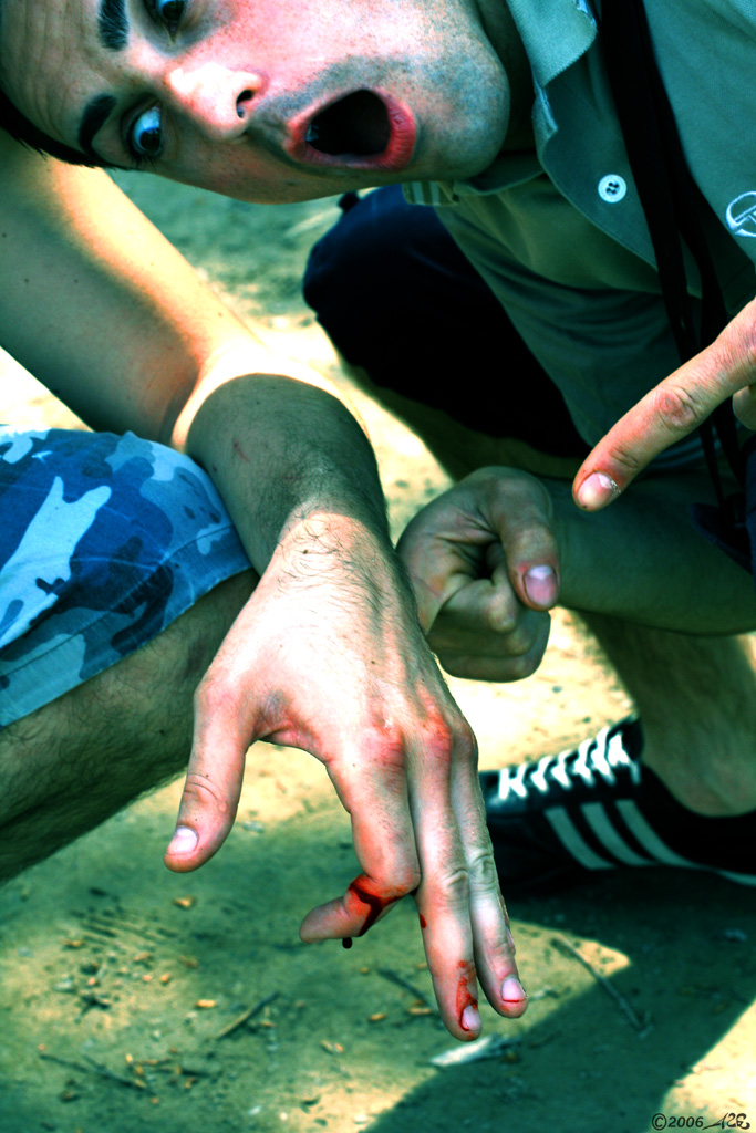 L'artista che si è fatto male, voleva prendere tagliare al volo un pezzo di qualcosa, non mi ricordo... Solo che non si sa come si è preso il dito...