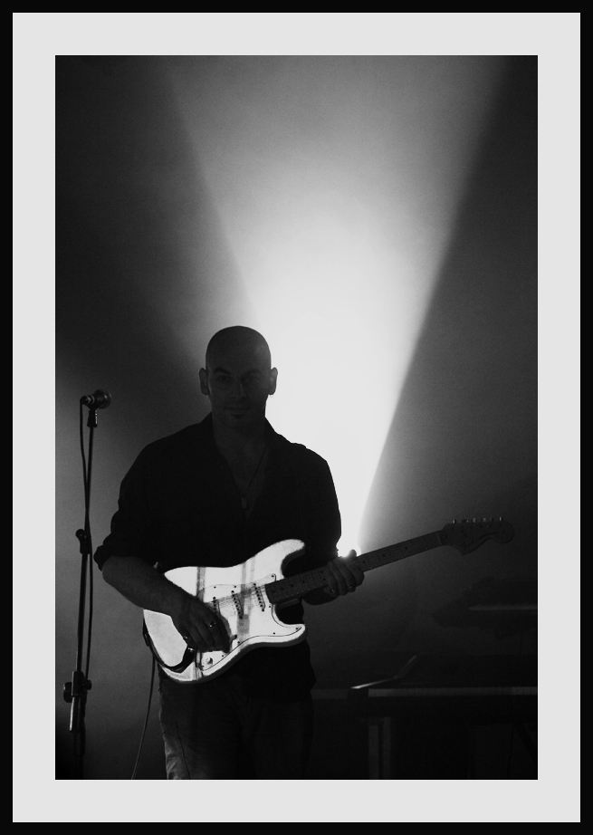 Perfetto il contrasto Bianco-Nero-Bianco frà Chitarra-Musicista-Fascio di luce.