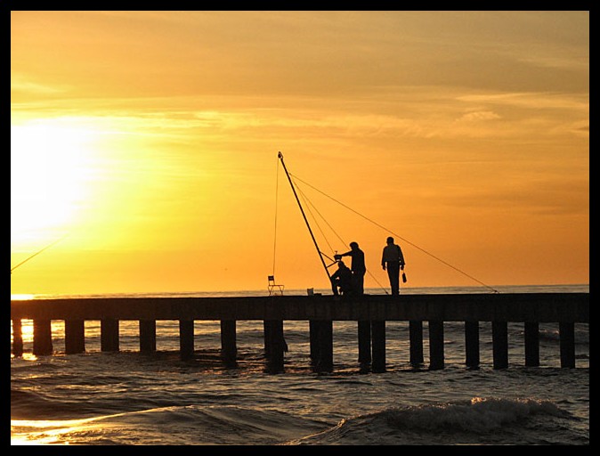 Fondamentalmente una bella foto, credo pecchi nell'inquadratura, un po' larga, per quanto siano affascinanti i riflessi dorati sull'acqua, la bruciatura in corrispondenza del cielo e la canna dell'altro pescatore temo distraggano troppo dai soggetti principali.