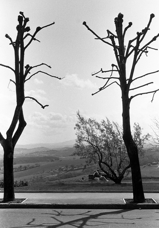 ottima composizione... i due alberi completamente spogliati fanno da sipario a una bellissima scena: un bell'albero con vicino una panchina e i ragazzi e una distesa verde che mette serenità... mi piace.