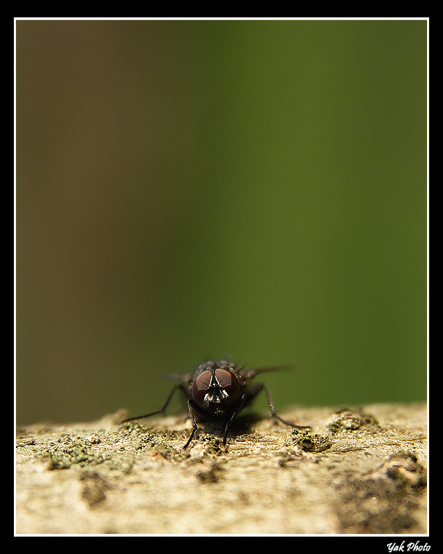 non so....lo sfondo è molto bello ma occupa troppo spazio ovviamente secondo me!la messa a fuoco è precisa!sotto la mosca si forma una zona in ombra che ostacola la lettura dei particolari.