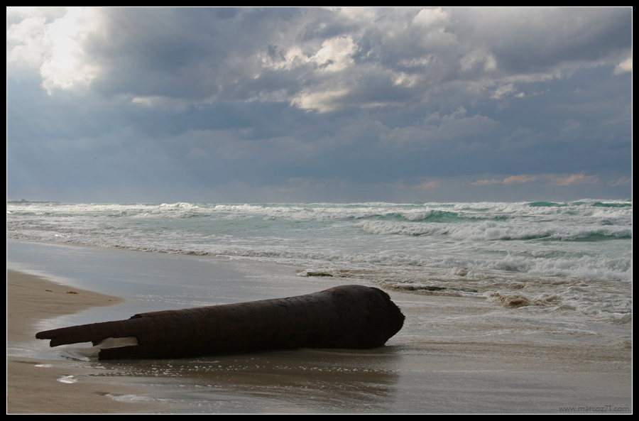 | Bel taglio, con la linea delle onde in obliquo rispetto alla fotografia. Giusta scelta del grandangolo come focale per dare importanza al soggetto, accentuando il ruolo di sfondo del mare. Anche il cielo non è male, le nubi e i deboli raggi di sole aggiungono valore all'immagine. Purtroppo il centro di interesse, permettimi il gioco di parole, non interessa un gran chè, un tronco di una palma morta non basta a fare da soggetto ad una cornice d'impatto.