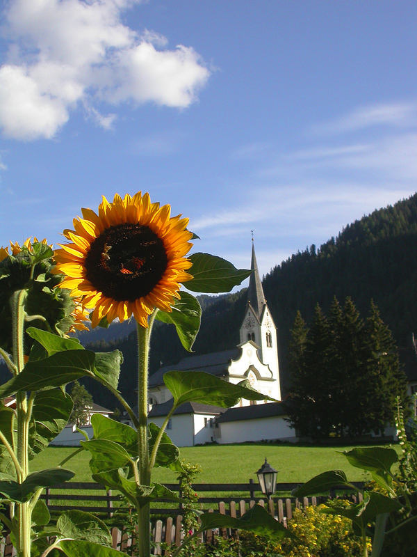 Avrei inoltre tagliato la parte bassa, con troppi elementi che non aggiungono niente. Questa foto e' fatta dal girasole con il contrasto del cielo, e il campanile sullo sfondo come contrappunto della composizione. La parte bassa disturba.