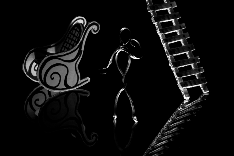 Realizzazione: ho fatto i modellini di cartoncino. Poi li ho posizionati su un tavolino di vetro (l'omino è appeso x un filo trasparente). La luce l'ho fatta con una torcia ed esposizione molto lunga (painting with light).