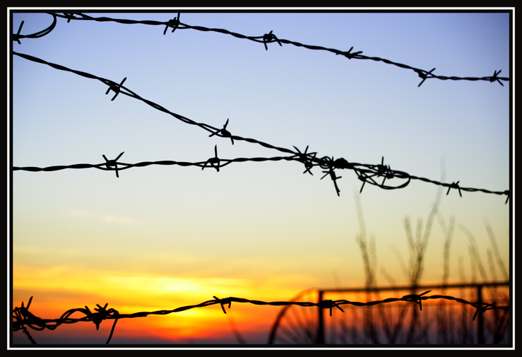 quoto domenico per gli elementi sfocati, ma la trovo indubbiamente bellissima! adoro i colori così intensi del tramonto, un tocco particolare il filo spinato....questa foto potrebbe fornire lo spunto per una poesia:ok: