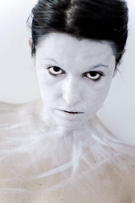 Bella idea, aggiungo ai consigli per migliorare lo scatto che vedrei più "imbiancato" anche il collo e l'inizio delle spalle verso il muro, in modo che il colore della pelle appaia progressivamente. Mi piacciono le "pennellate" di bianco che si incrociano.