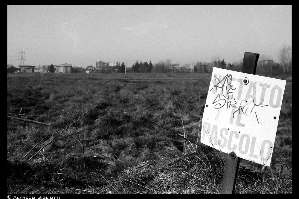 per me il cartello non è troppo luminoso. c'è il nero pieno, è la scritta che è stinta, il che aggiuge qualcosa alla foto. ma quello che a mio parere da valore è la profondità di campo scelta, che è quella giusta per dare l'idea dello spazio indifferenziato senza però sfuocare troppo, cosa che avrebbe tolto il senso di denuncia.
