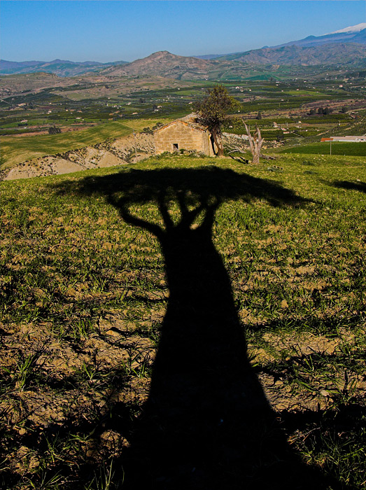 questa foto è iperespressiva; e si presta a varie interpretazioni.. ci si può fermare al semplice apprezzamento estetico del contrasto tra ombra e ambiente ripreso.. ma a me ispira un senso di paura. Il motivo è questo: mi appare come la metafora di una presenza inquietante che si allunga sinistramente verso la casetta campestre, come per ghermirla.. con qualche propaggine artigliata che dall'ombra della chioma si spinge verso l'edificio, l'effetto sarebbe ben drammatico..